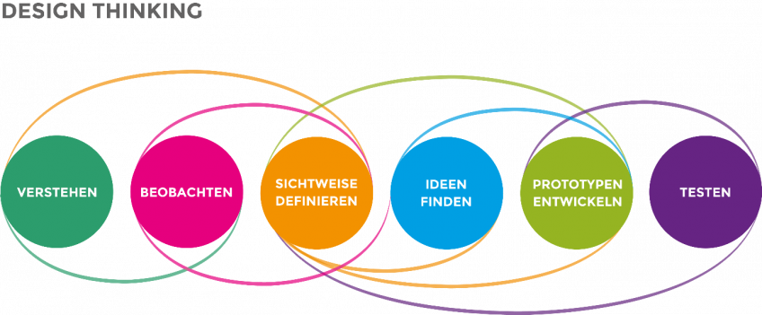 Design Thinking ist ein iterativer Prozess aus sechs Schritten gemäß der Abbildung. Er verbindet dadurch Innovation mit Realisierbarkeit und Marktfähigkeit.