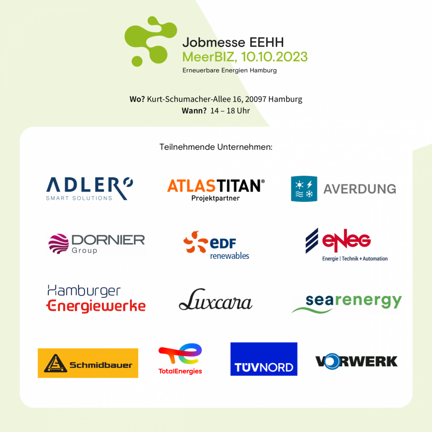 Erste EEHH-Jobmesse für Berufe der erneuerbaren Energien Erneuerbare Energien Hamburg Cluster und Agentur für Arbeit laden am 10.10.2023 ins Berufsinformationszentrum Hamburg ein